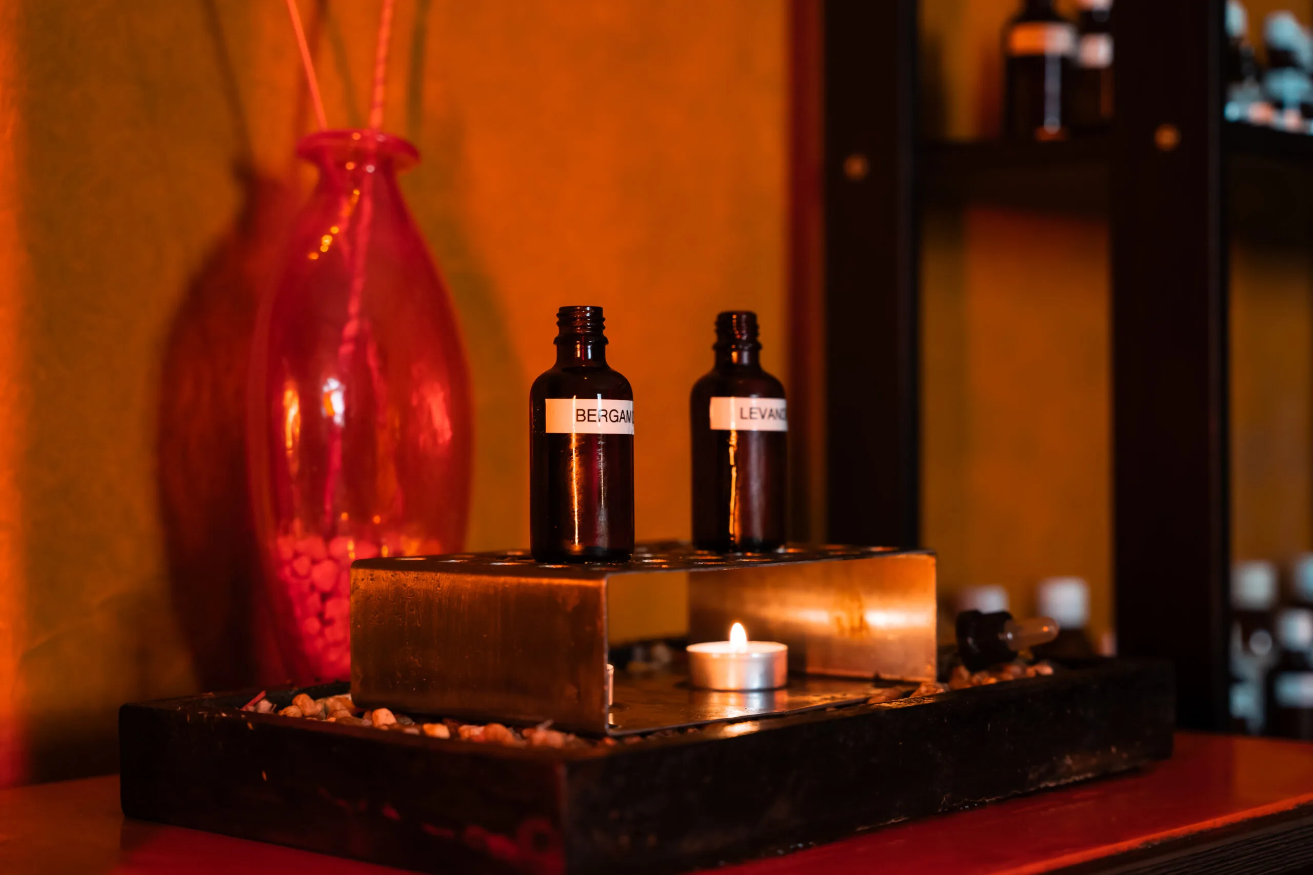According the purpose and goal of the session inside Almond oil I add a combination of Essential Oils: